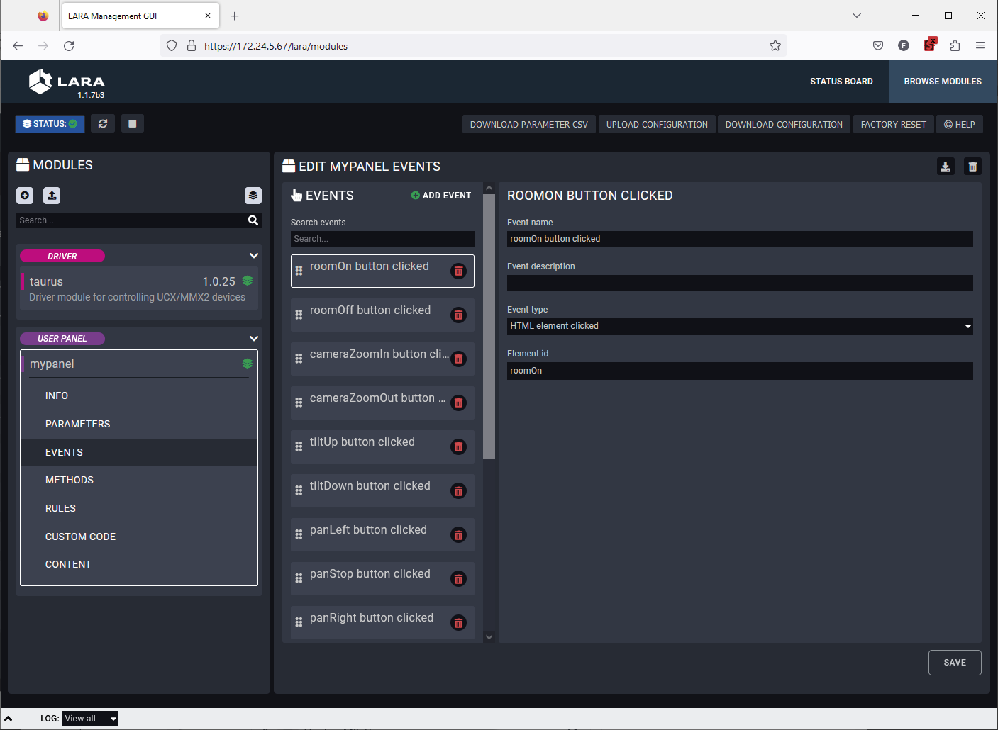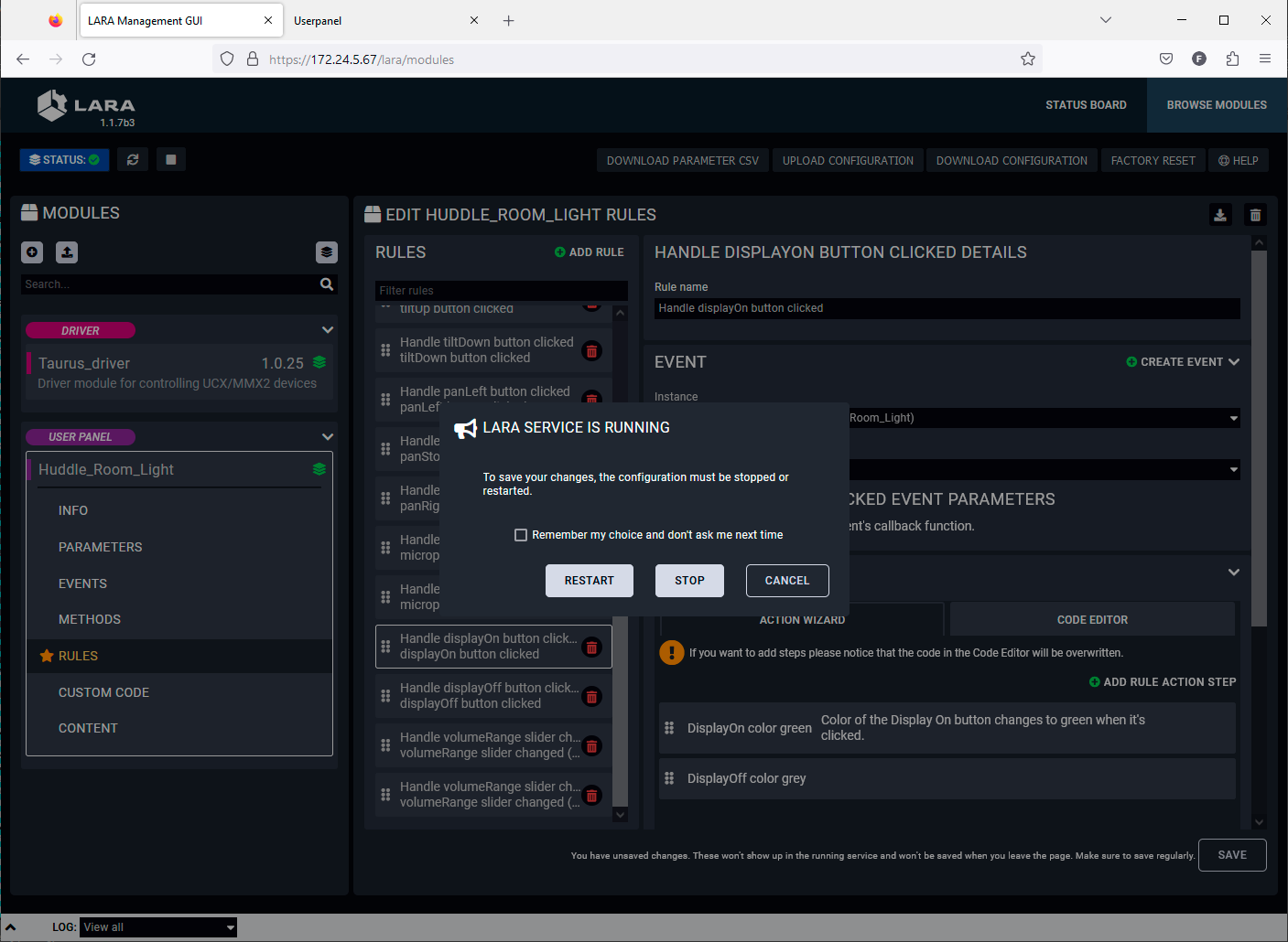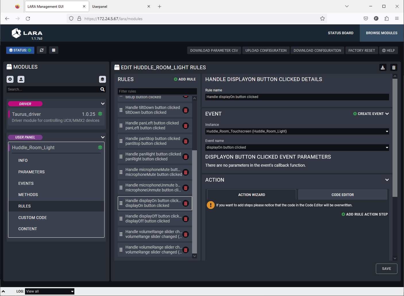 With LARA, you can automate your meeting rooms, create or re-use software Modules by using the power of JavaScript, control the behavior of the Taurus and connect it to other third-party devices or services, or do virtually everything that is possible.