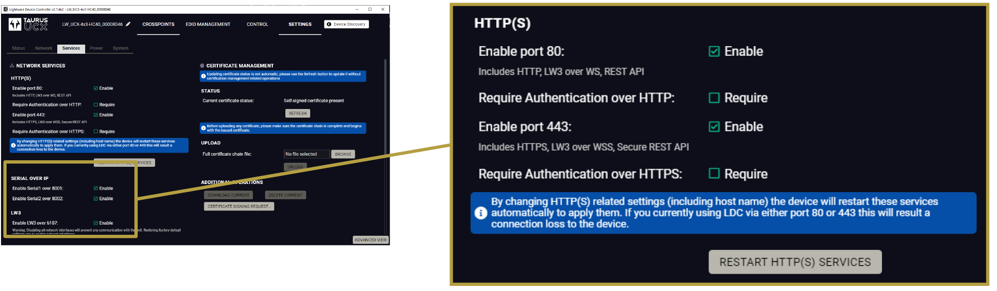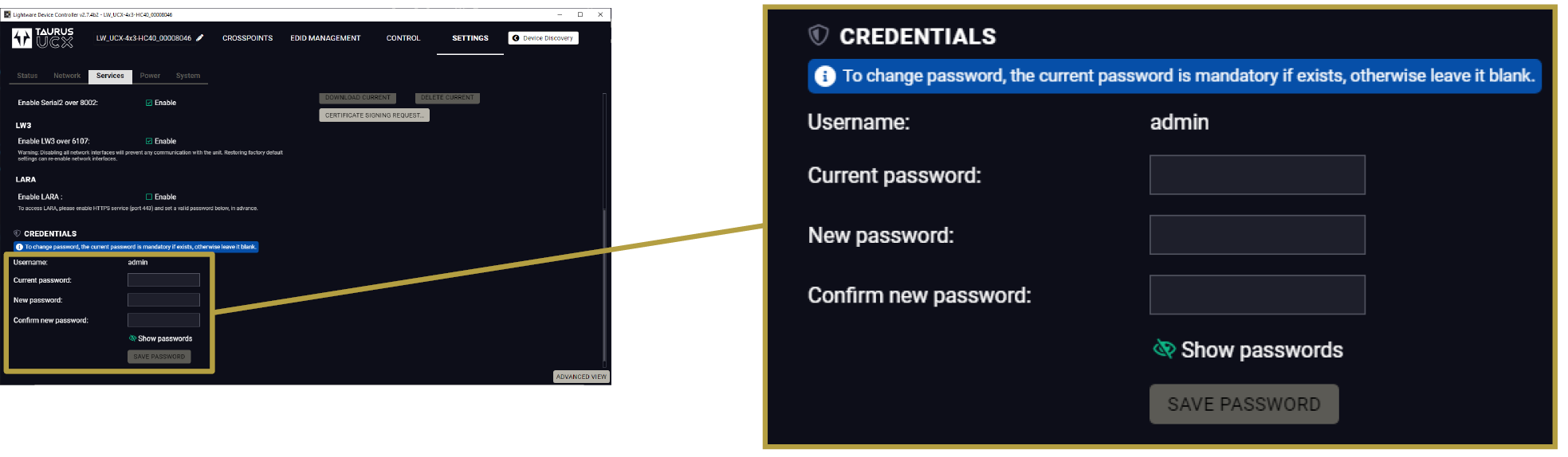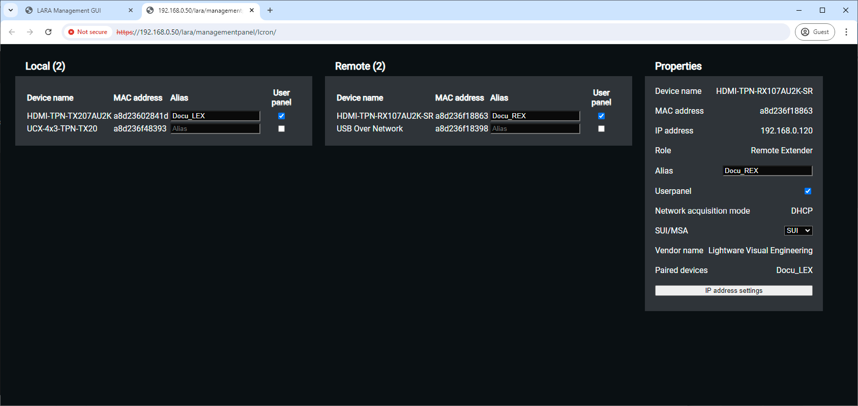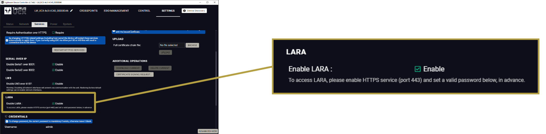 LARA is part of the Lightware product, however, it is an independent entity in the device. Since the device is protected with a password, LARA is also safe from unwanted modifications. |