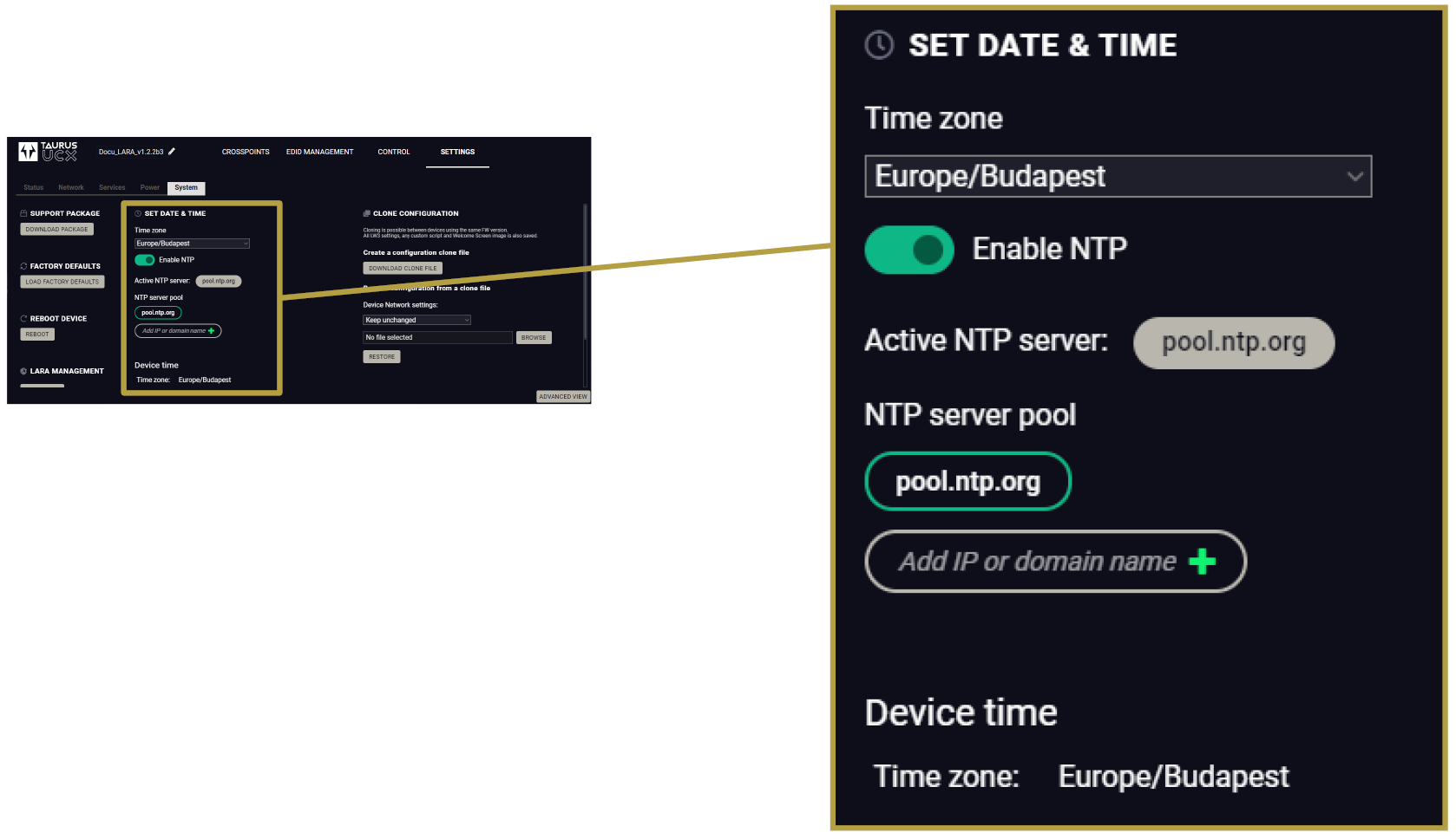 ▪The Taurus/MMX2/CTU configuration contains the whole LARA configuration as well. If the device configuration is handled with Bulk management or with the Backup/Restore feature, LARA settings can be preserved.