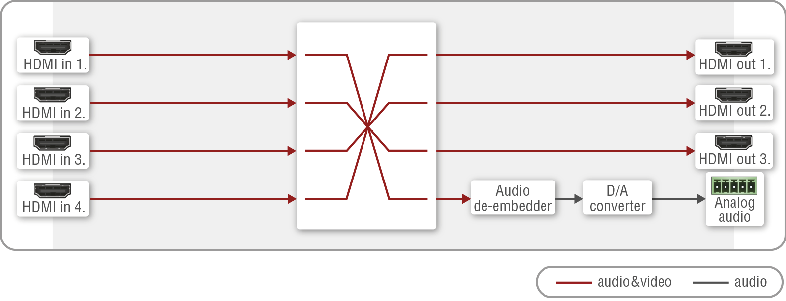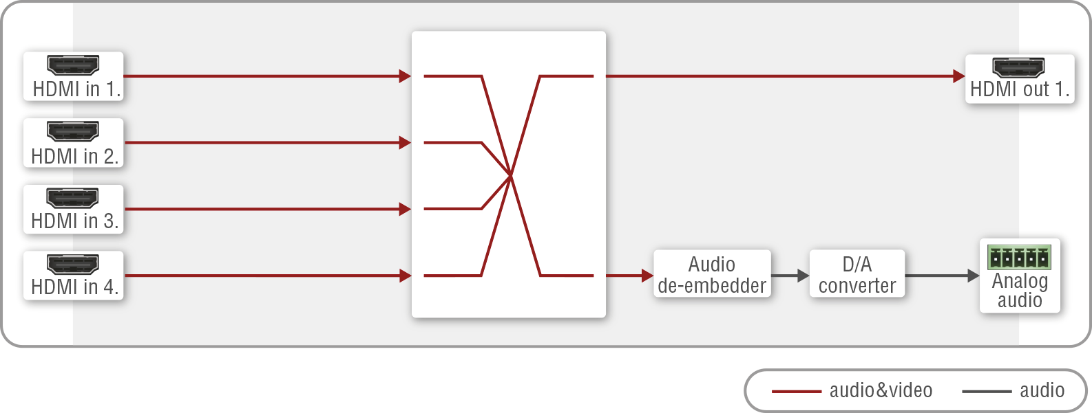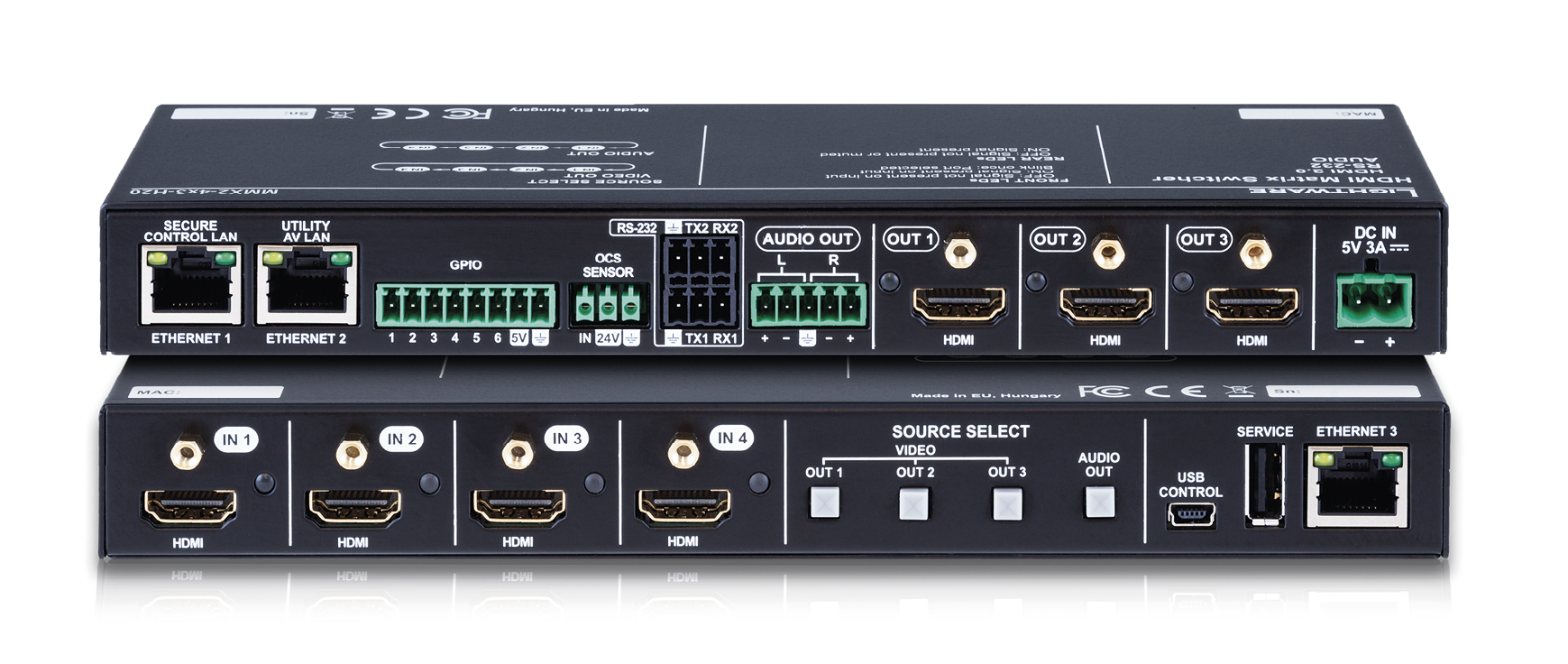 MMX2 series devices is a uniquely mini size matrix switcher. It has four HDMI inputs and HDMI output(s). Audio can be de-embedded from the HDMI signal to a balanced 5-pole Phoenix® (Euroblock) port. The volume and gain properties of the audio signal can be modified at the analog audio output port. The unit is HMDI 2.0 compatible by supporting 4K@60Hz signals at 4:4:4 subsampling and supporting HDCP v2.2.