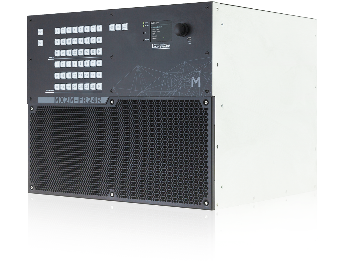 MX2M-FR24R is a member of the Lightware MX2 modular matrix switcher series, supporting uncompressed 4K UHD resolution at 60Hz with 4:4:4 sampling pattern and with down-conversion capabilities to 4:2:2, supporting HDCP 1.x and 2.3, 3D, Dolby TrueHD and DTS-HD Master Audio. The non-blocking matrix architecture distributes and switches 24 video signals to 24 outputs, distributed along six 4-port boards respectively per direction.