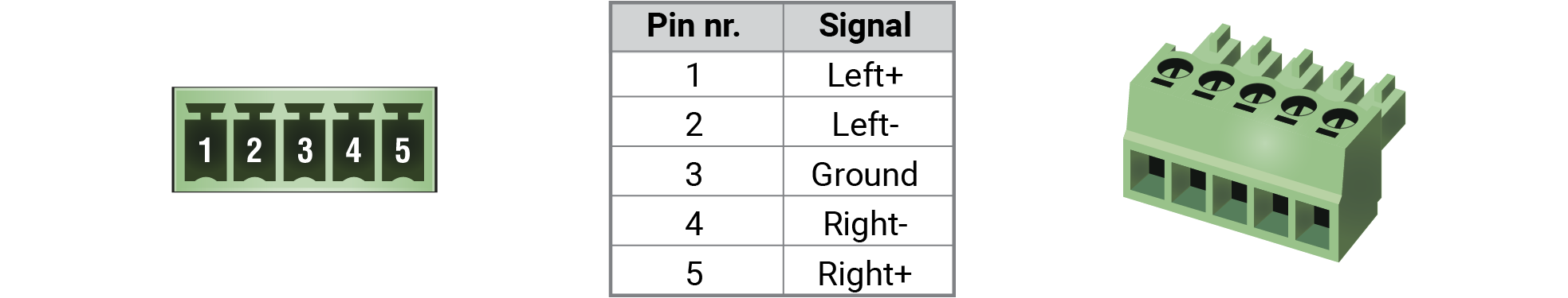 HDMI or DP output ports for connecting sink devices. Audio output ports (5-pole Phoenix) for balanced analog audio output signal. The signal is de-embedded from the given video port (in -A suffixed models). |