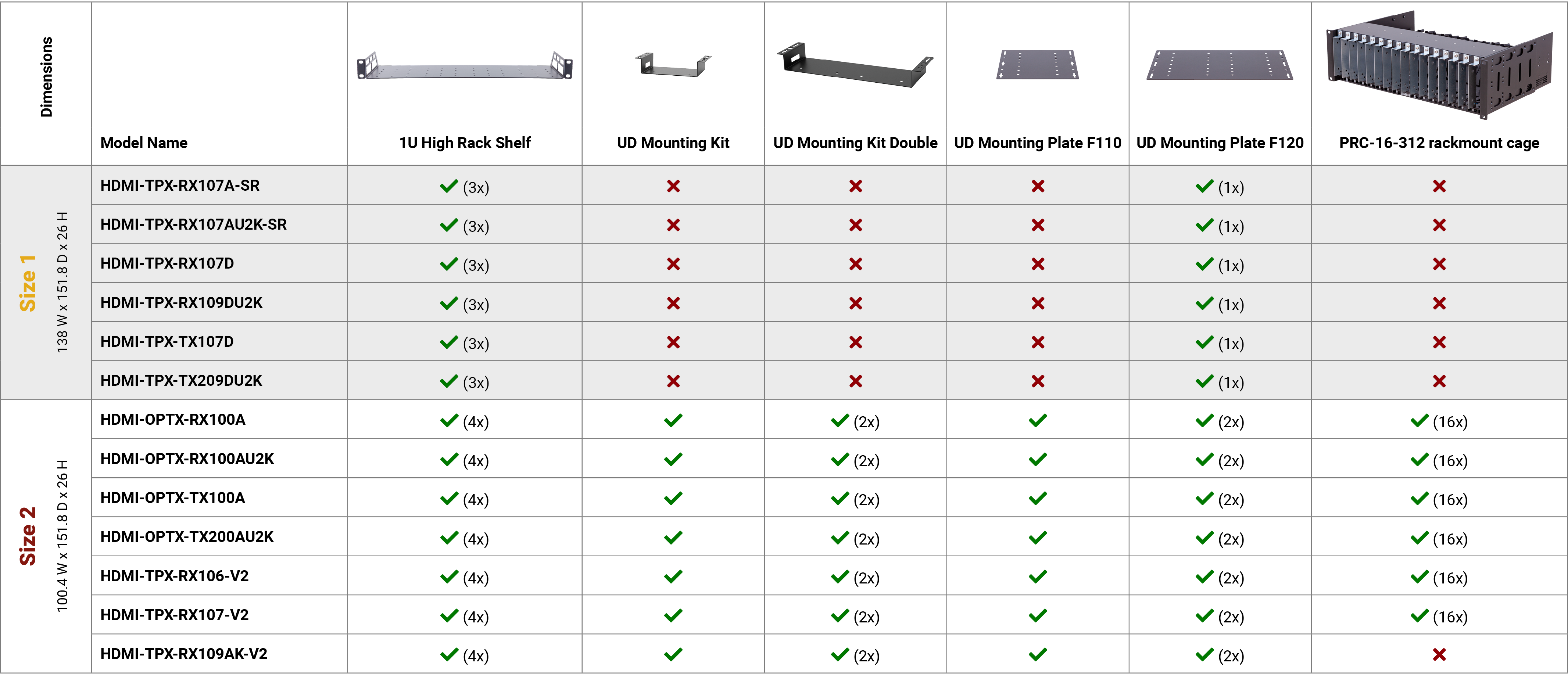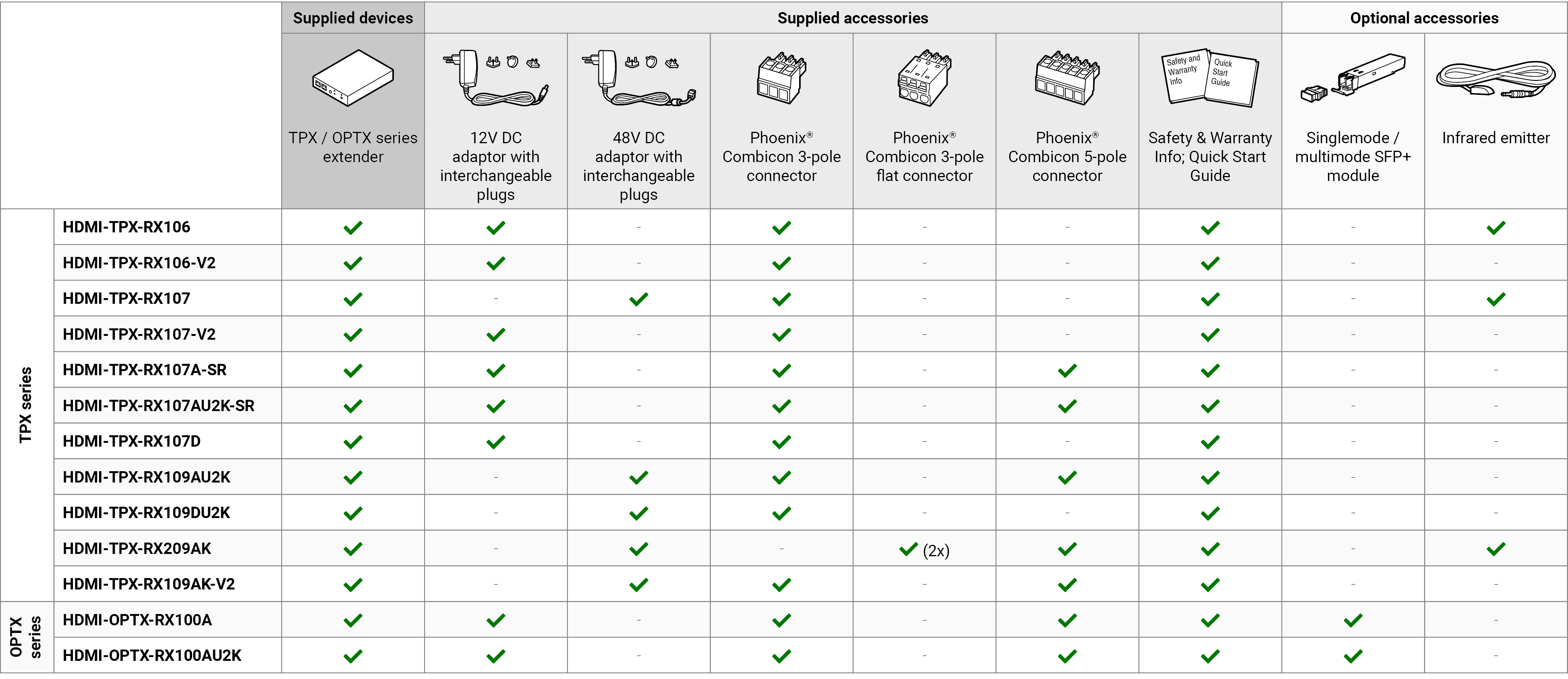 The following table describes all supplied and optional accessories of the TPX/OPTX series devices by models. The optional (not-supplied) accessories can be purchased separately; please contact sales@lightware.com.