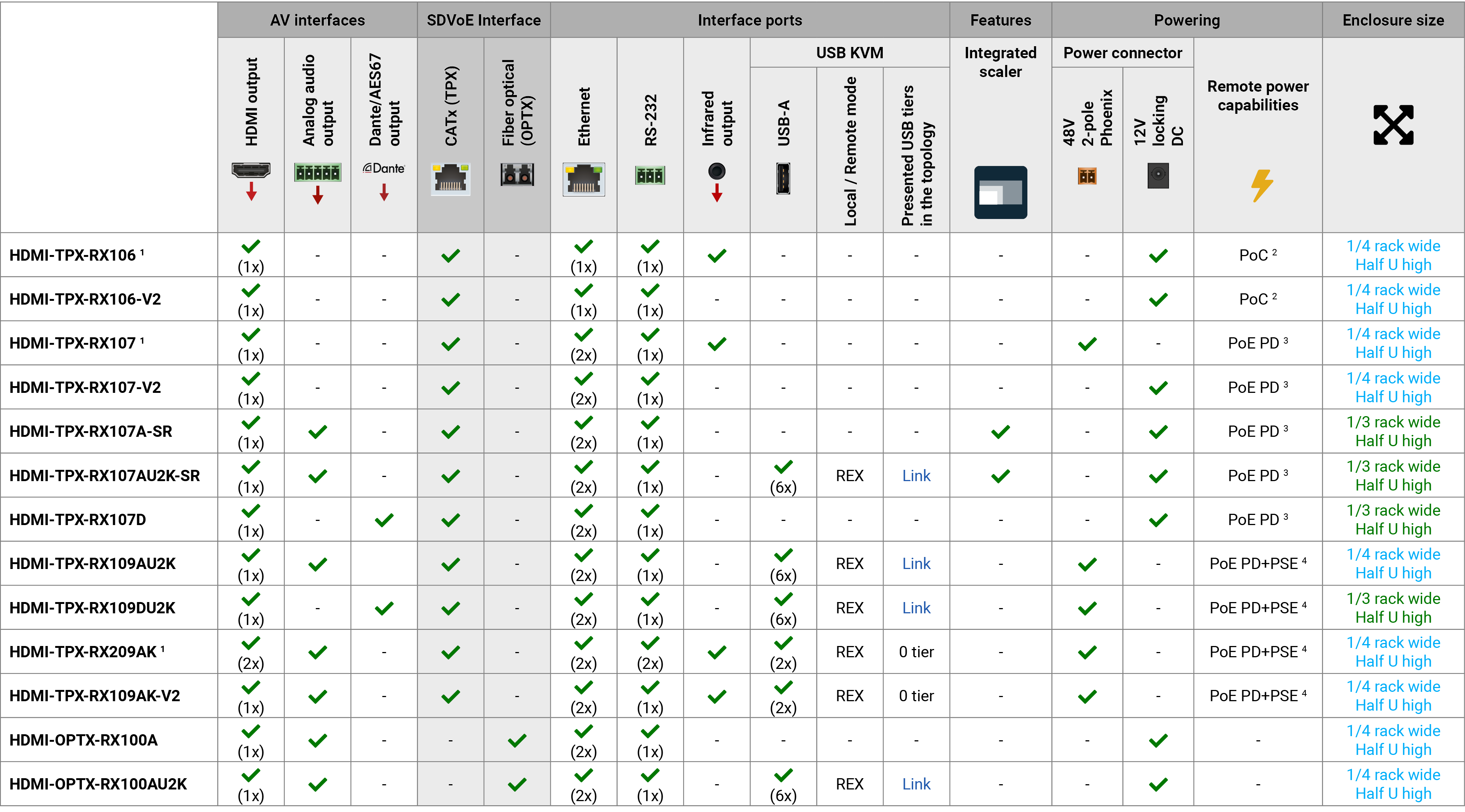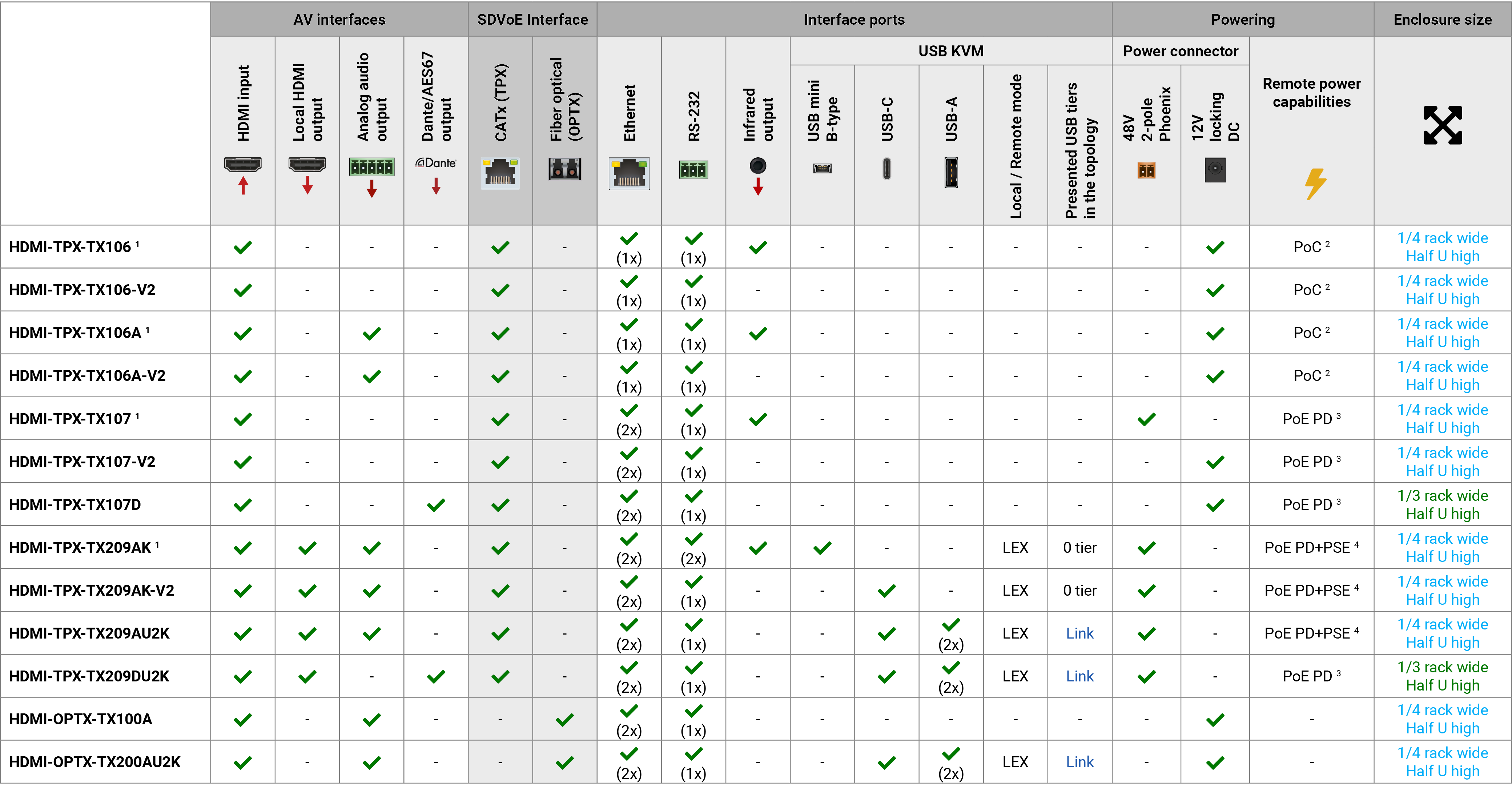 The TPX / OPTX series transmitter and receiver devices are based on SDVoE technology and allow users to extend HDMI 2.0 compliant video, audio and control signals from a single source to a single destination when they are directly connected.