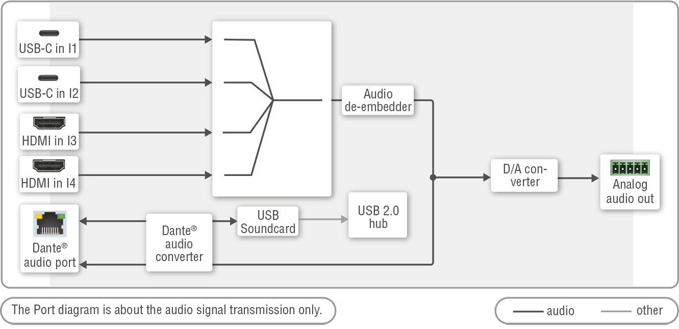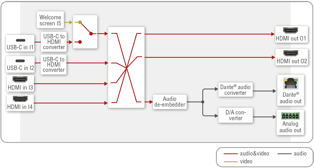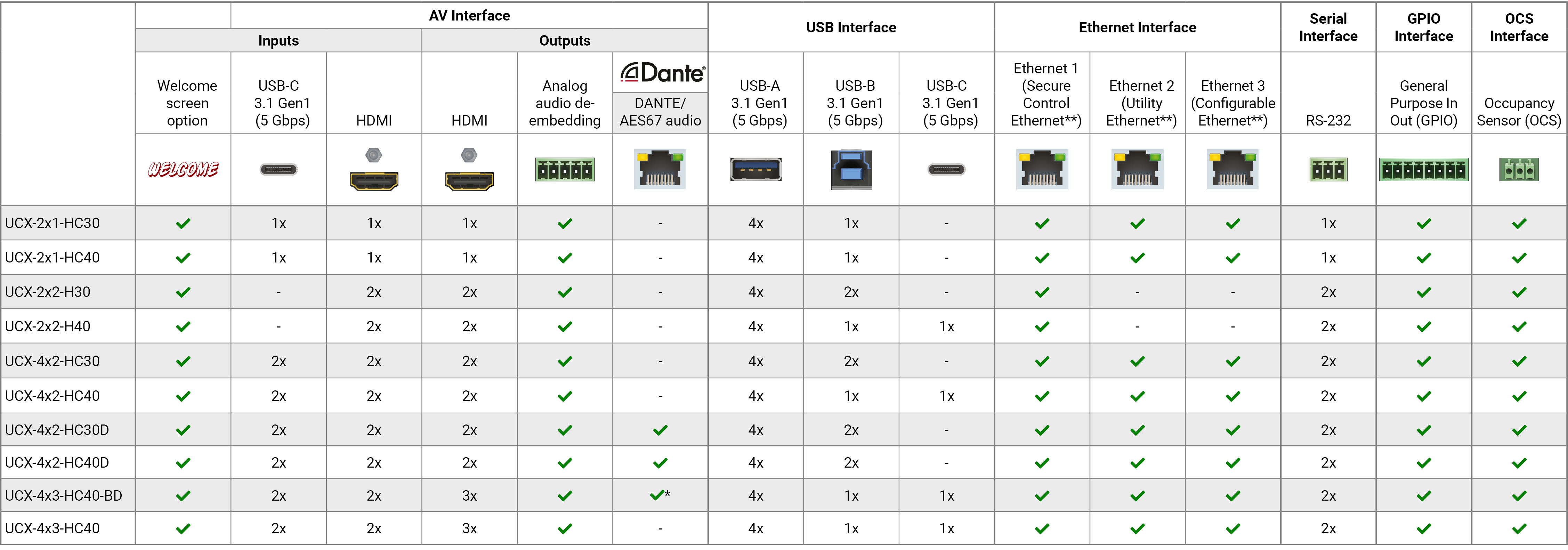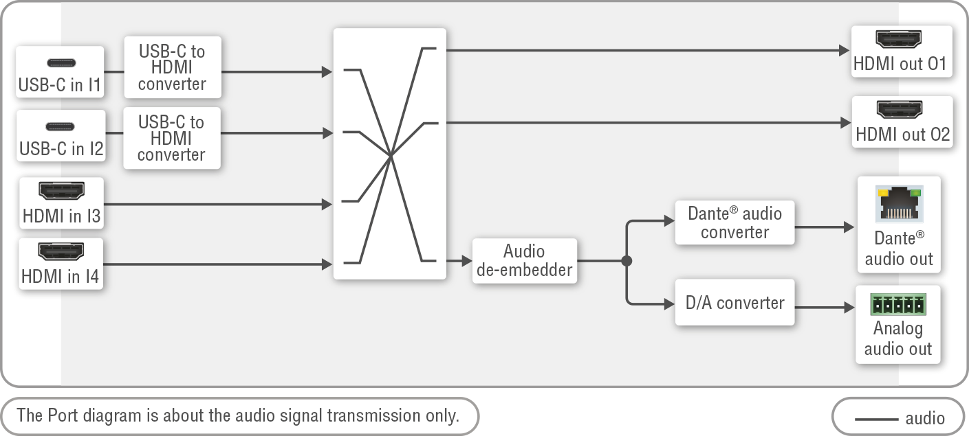 The UCX-4x2-HC30D, UCX-4x2-HC40D and UCX-4x3-HC40-BD models also thrive when it comes to audio capabilities, offering analog audio de-embedding feature, as well as support for DANTE/AES67 network connection to send DANTE/AES67 audio stream directly to a dedicated audio system. See more details in the Dante® Audio Interface section.
