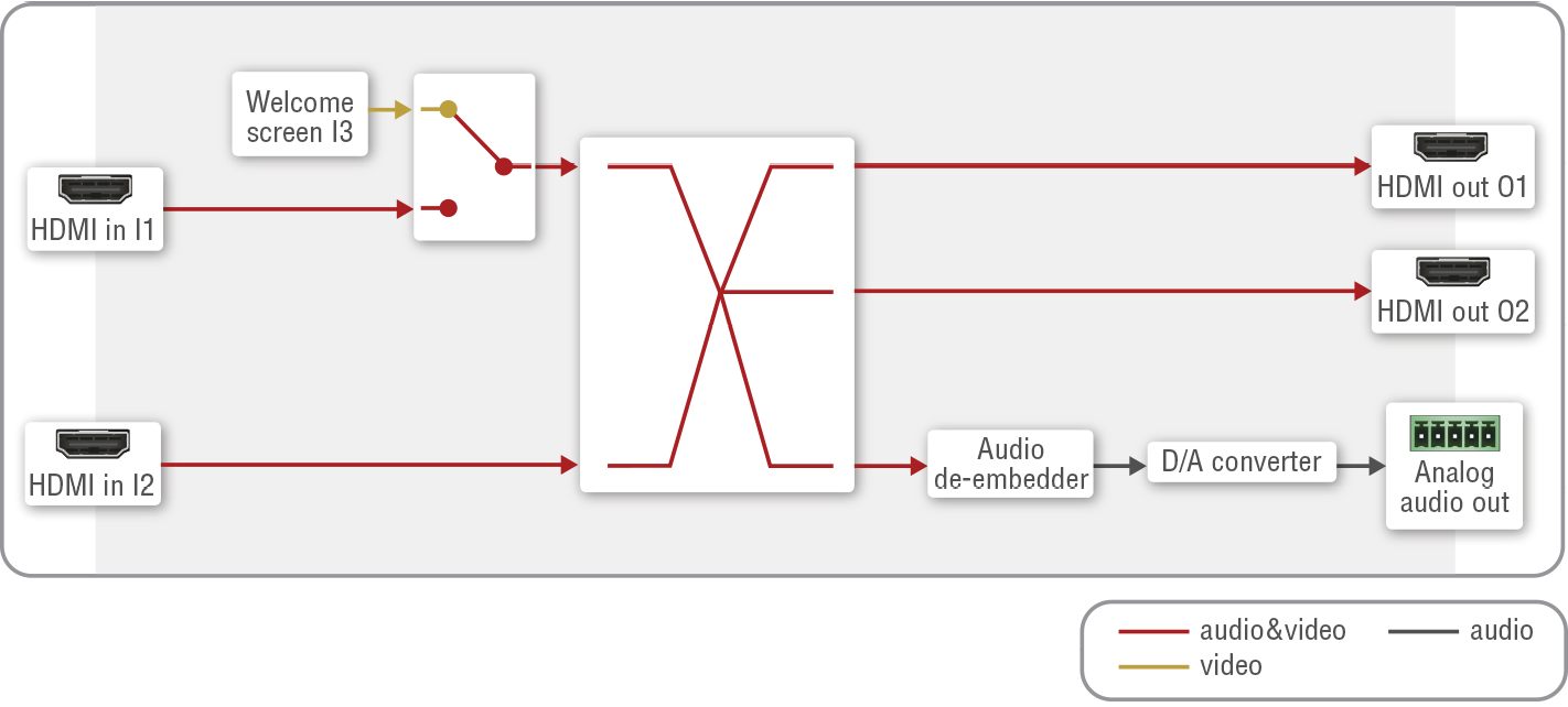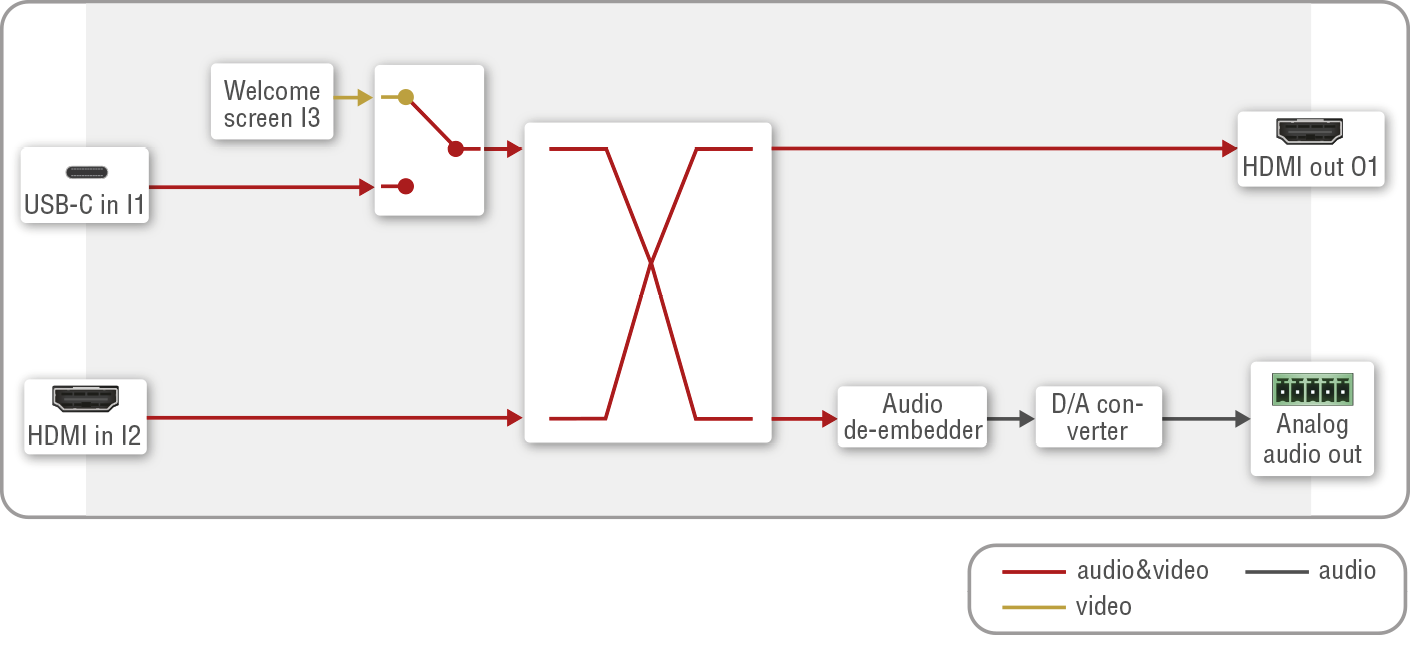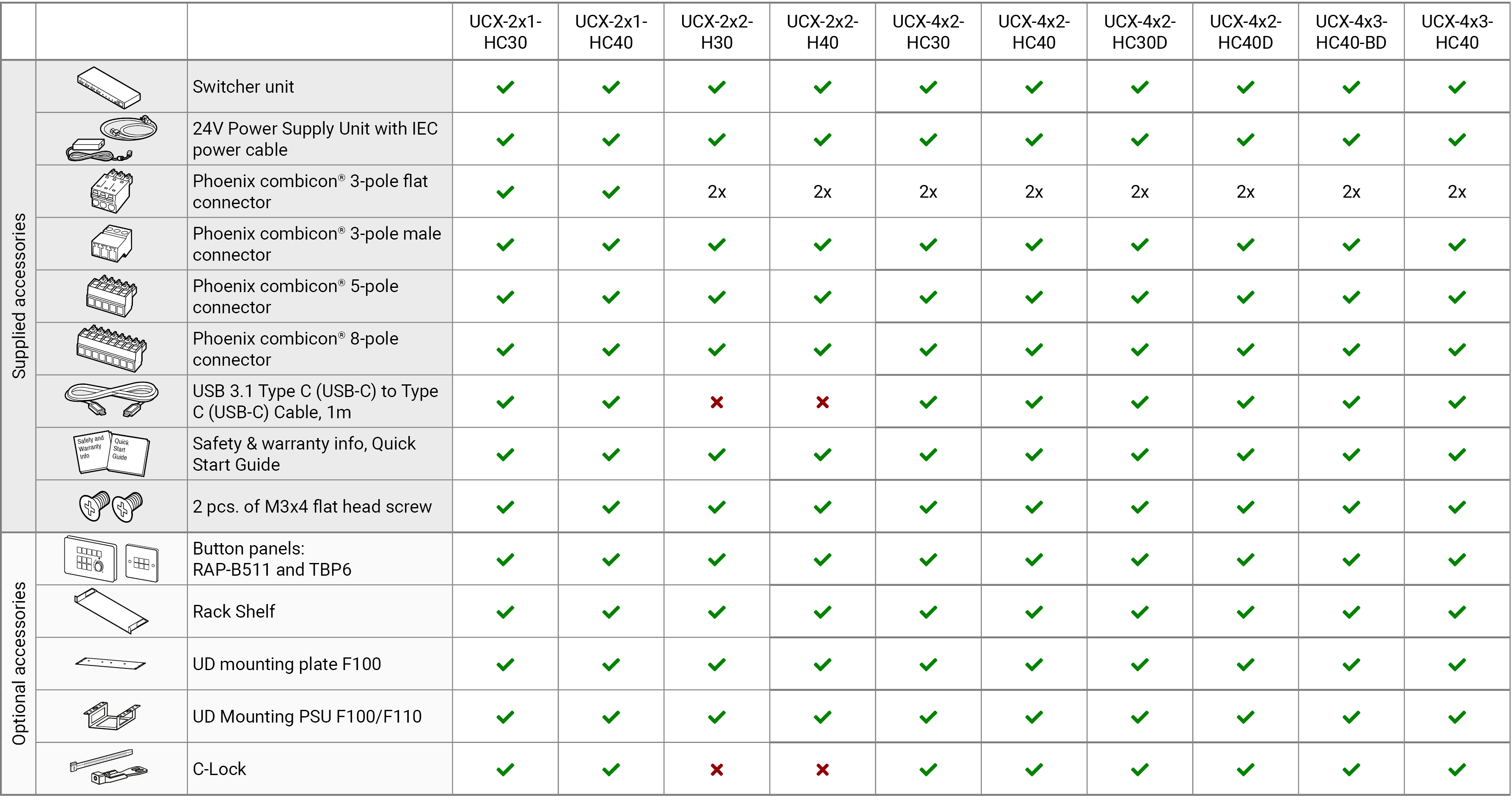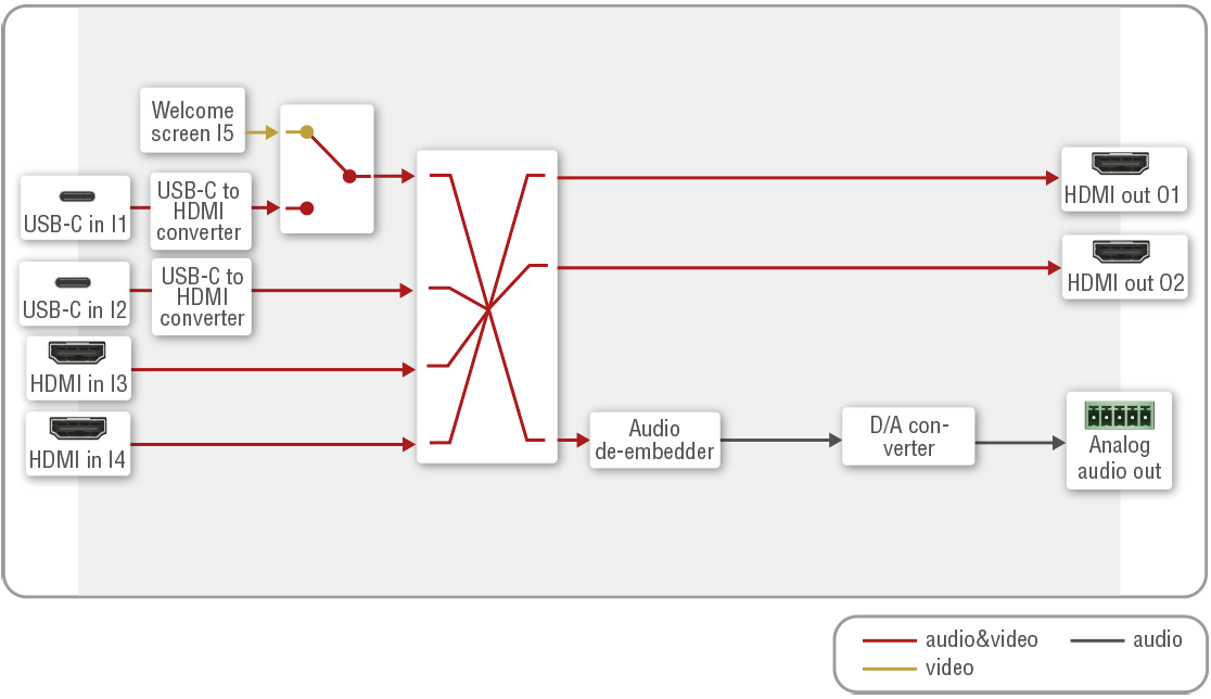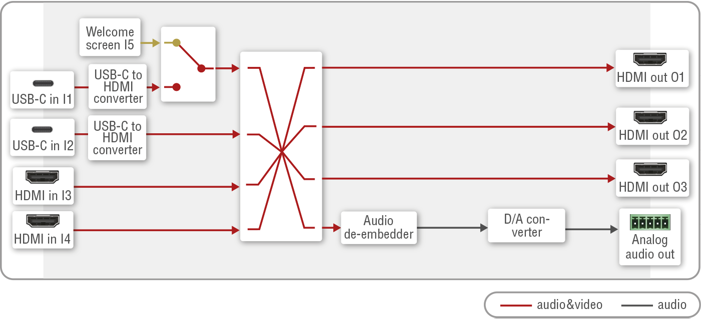The UCX-4x2-HC30D, UCX-4x2-HC40D and UCX-4x3-HC40-BD models also thrive when it comes to audio capabilities, offering analog audio de-embedding feature, as well as support for DANTE/AES67 network connection to send DANTE/AES67 audio stream directly to a dedicated audio system. See more details in the Dante® Audio Interface section.