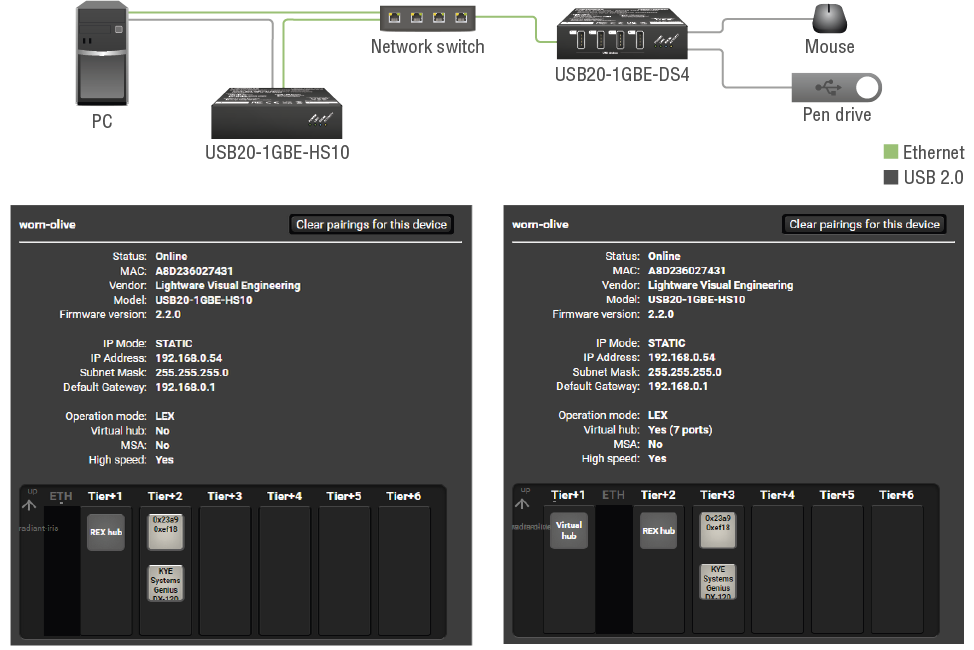 Number of TIER to USB 2.0 layer (per extender pair, virtual hub mode) |